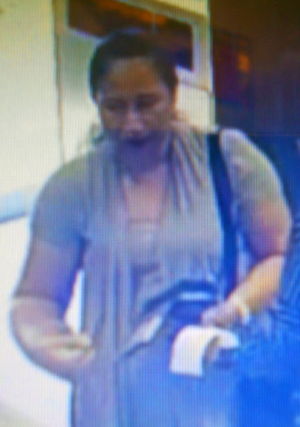 Security video showed the woman pictured grabbing the unattended purse, looking in it, then taking it with her as she left. This woman was accompanied by a man and a young female, presumably her family.
