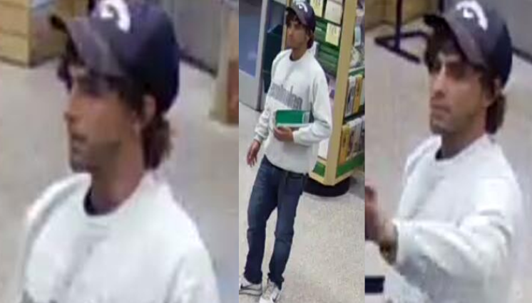 The suspect is described as a white or Hispanic male in his twenties with dark hair, wearing a light colored sweatshirt and dark colored ball cap.