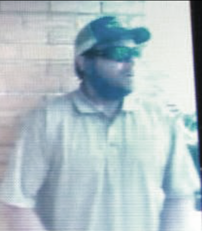 The person is described as a white male, in his late 20's or early 30's. At the time, this photo was taken, he was wearing a blue face cover, sunglasses, baseball cap, tan polo shirt and blue jeans.